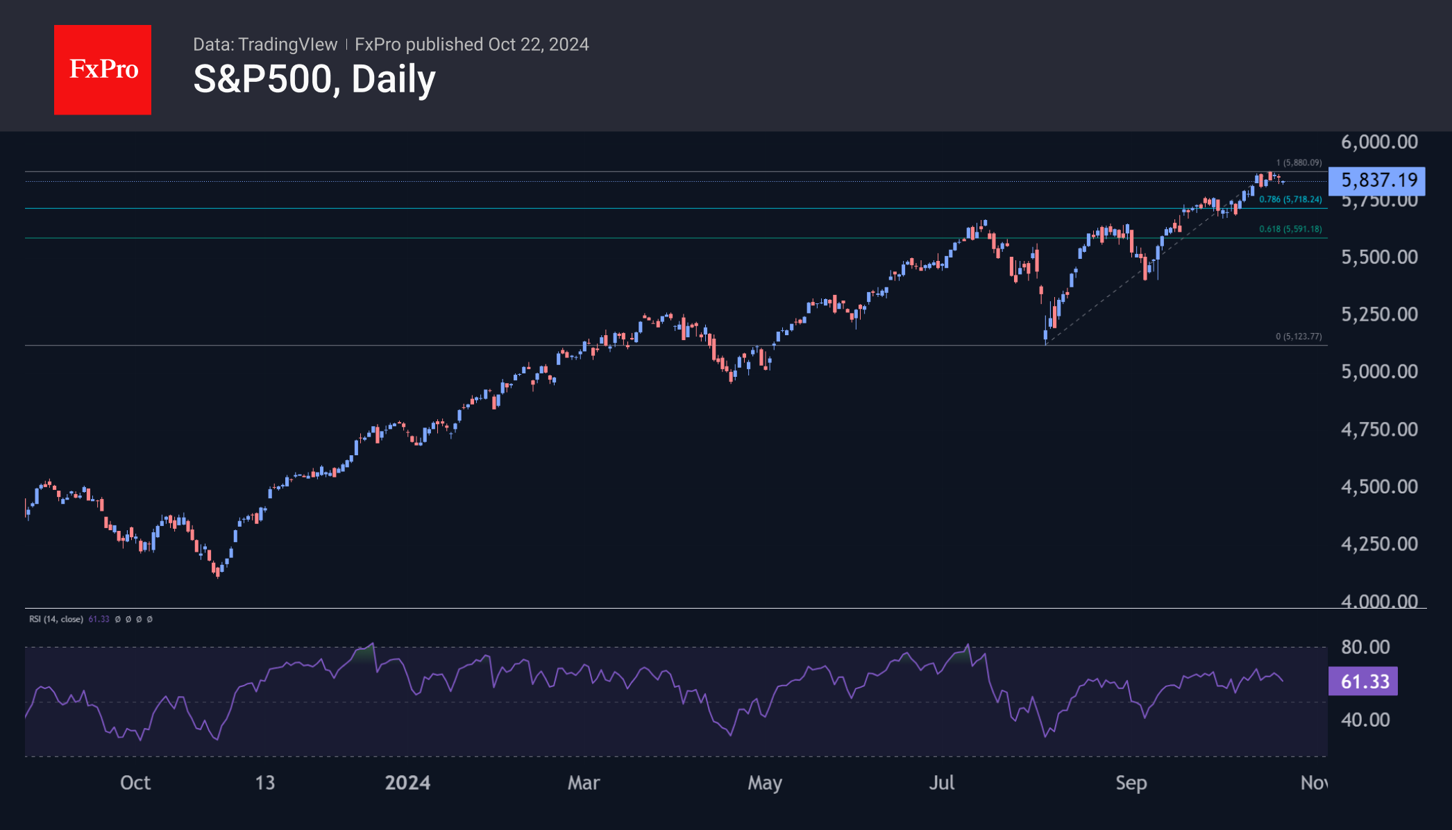 考虑到选举前通常存在的不确定性,这种下跌看起来也是合理的。这一次,由于候选人之间的竞争非常激烈,在美国这种情况被拉长了,目前还没有明显的赢家。另外,我们来看一下标准普尔500指数的相对强弱指数(RSI)和价格背离情况:价格远高于7月的峰值,而相对强弱指数在上周初达到70的峰值后,已经回落至59。