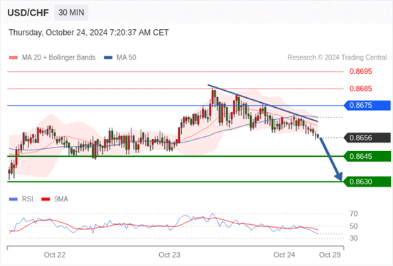 在 0.8675 之下,看跌,目标价位为 0.8645 ,然后为 0.8630 。