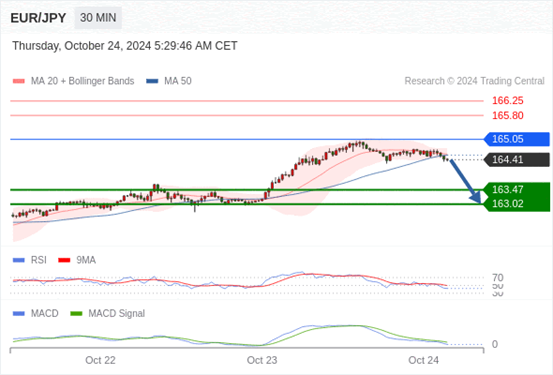 欧元/日元 当日内: 看跌,在 165.05 之下。