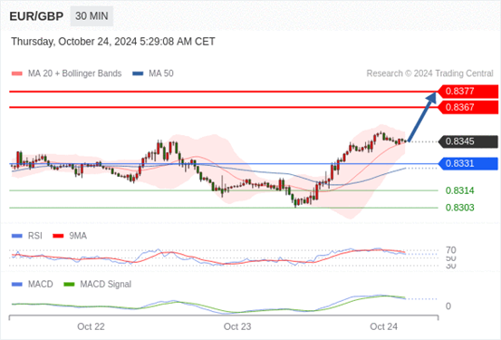 欧元/英镑 当日内: 看涨,当 0.8331 为支撑位,目标定在0.8377。