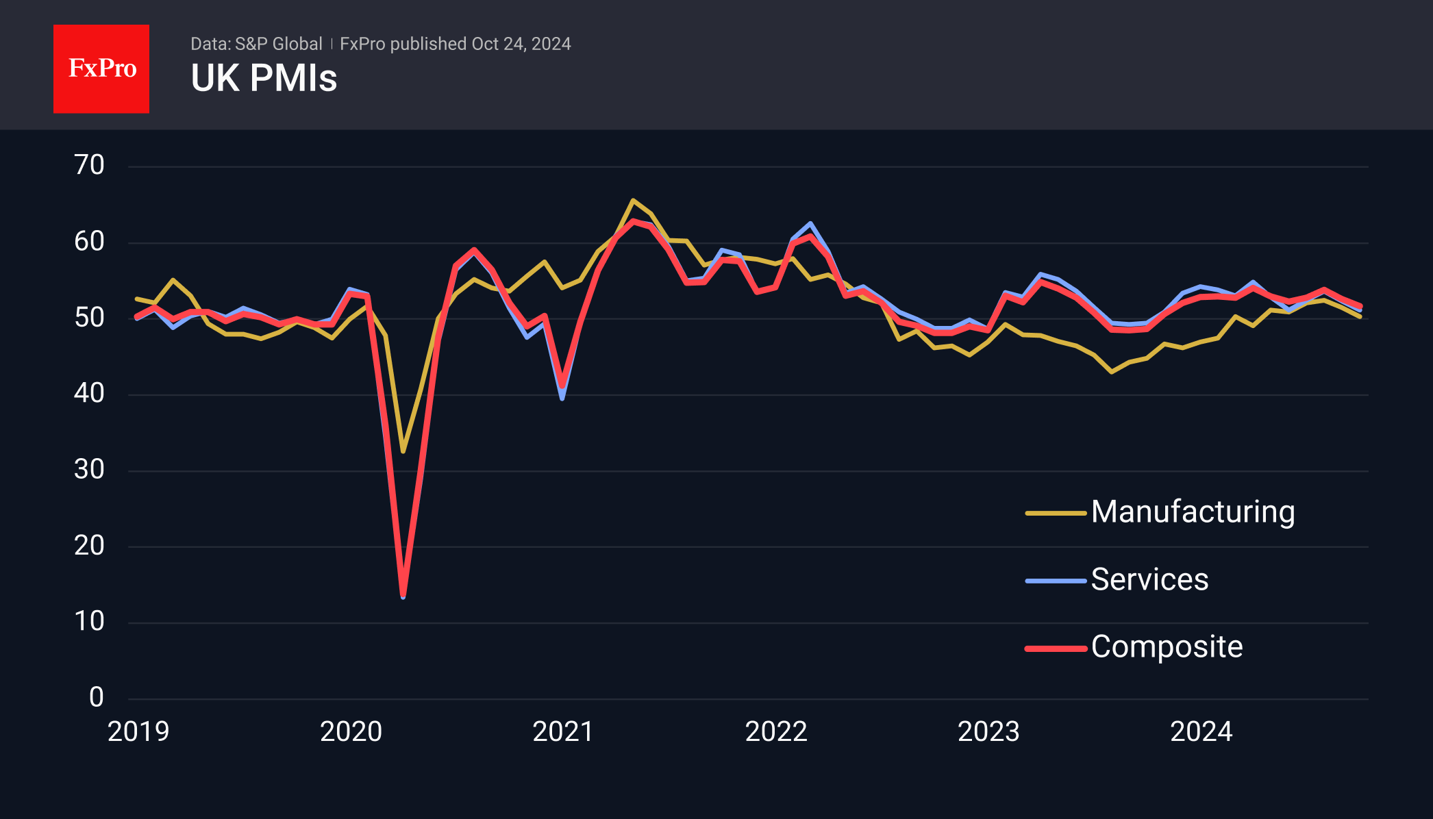 美元似乎已经涨不动了。这就解释了为什么英镑兑美元汇率自昨日开盘上涨了0.5%达到1.2980,尽管英国10月的采购经理人指数(PMI)未能达到维持先前水平的预期。
