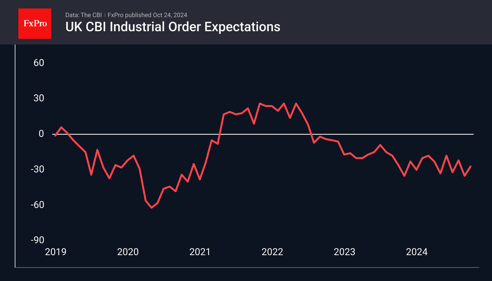 CBI的另一份报告指出,工业订单的下降略有放缓,相应的指数从-35上升到-27。
