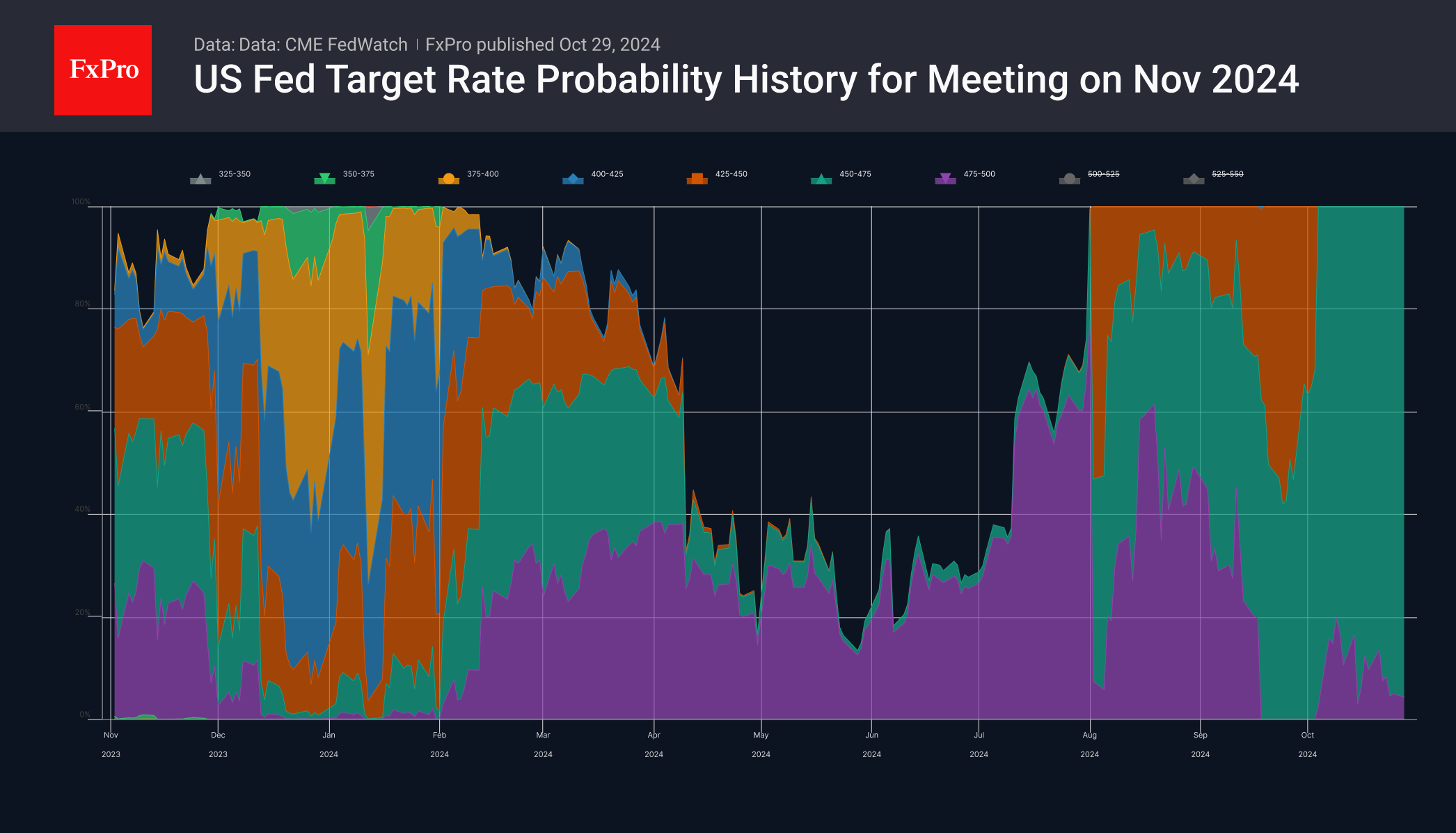 首先,随着市场对美联储关键利率前景的预期结束,美元汇率将企稳。从9月底到10月10日,市场在预期的降息50个基点和20%没有变化的可能性之间波动。然而,在过去的两周里,人们对放松25个基点的信心越来越大,剩下约有10%的可能性没有变化。美联储在今年年底前还有30%的可能性只允许降息25个基点。这是一种强硬的情况,吸引了美元的买家和长期美国国债的卖家。