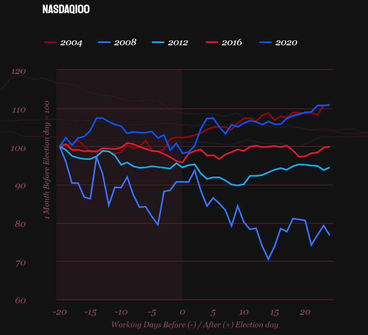 在选举前几周经历了一段时间的低迷之后,股市往往在选举后不久就会反弹。但值得注意的是,在之前的选举中,股指的修正比我们现在看到的更深入、更快。有可能会重现历史新高,但预计选举日后的一年剩余时间不会增长10%或15%,正如我们在2016年和2020年看到的,甚至是2012年的7%。
