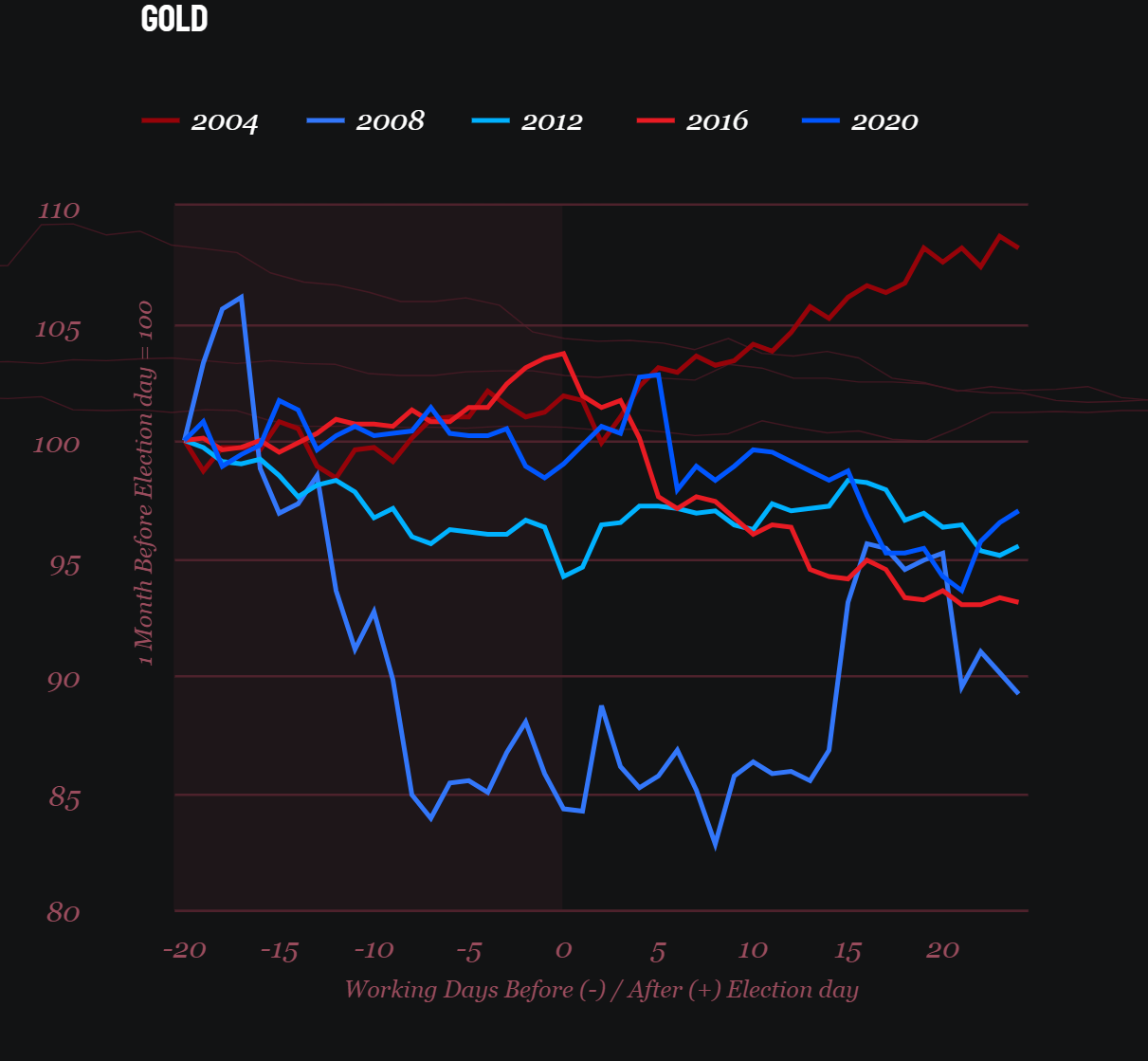 特朗普当选后,金价盘中上涨5%,但在收盘前抵消掉了涨幅,到年底下跌了14%。然而,一般来说,黄金更多地与货币政策周期有关,而不是与个别总统有关。假设特朗普执政期间美国通胀率上升,我们应该预期美联储会提高利率,从而给黄金价格带来更大压力。