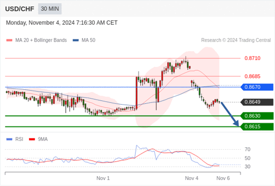 在 0.8670 之下,看跌,目标价位为 0.8630 ,然后为 0.8615 。