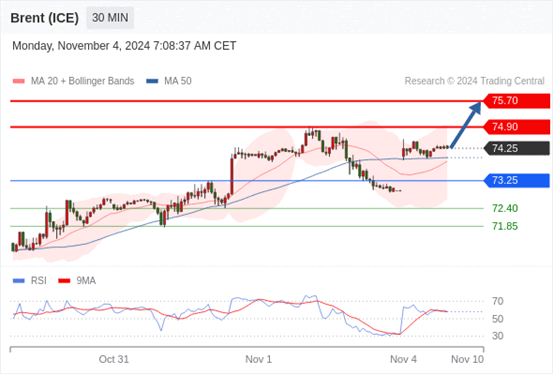 在 73.25 之上,看涨,目标价位为 74.90 ,然后为 75.70 。