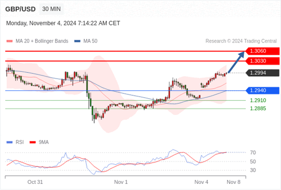 在 1.2940 之上,看涨,目标价位为 1.3030 ,然后为 1.3060 。