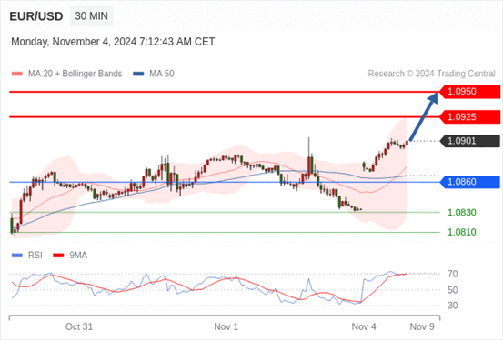 在 1.0860 之上,看涨,目标价位为 1.0925 ,然后为 1.0950 。