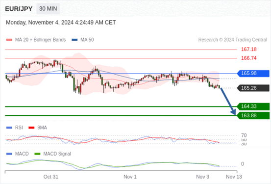 欧元/日元 当日内: 看跌,在 165.98 之下。