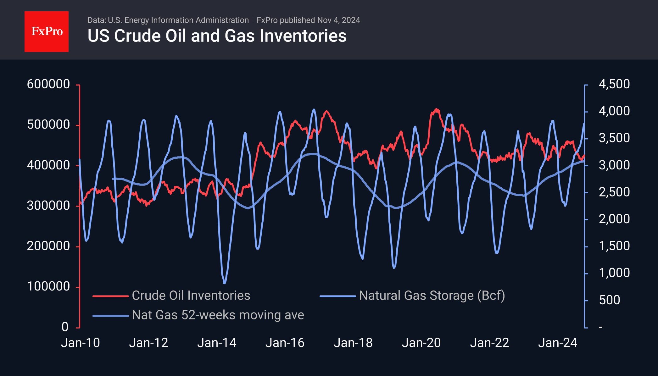 天然气(石油最接近的替代品)的储量处于近四年来的高位。移动平均线(它能消除年内波动)已经达到了2016年和2020年的高点,这表明在这个世界最大的经济体中碳氢化合物供应过剩。