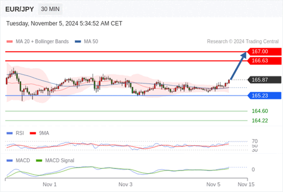 欧元/日元 当日内: 看涨,当 165.23 为支撑位。