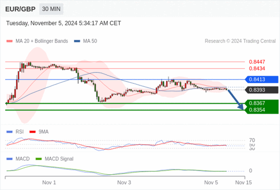 欧元/英镑 当日内: 看跌,在 0.8413 之下。