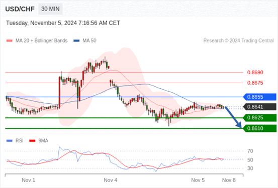 美元/瑞郎 当日内: 短期关键阻力位在0.8655。