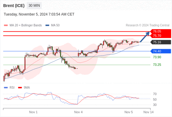 在 74.40 之上,看涨,目标价位为 75.70 ,然后为 76.05 。