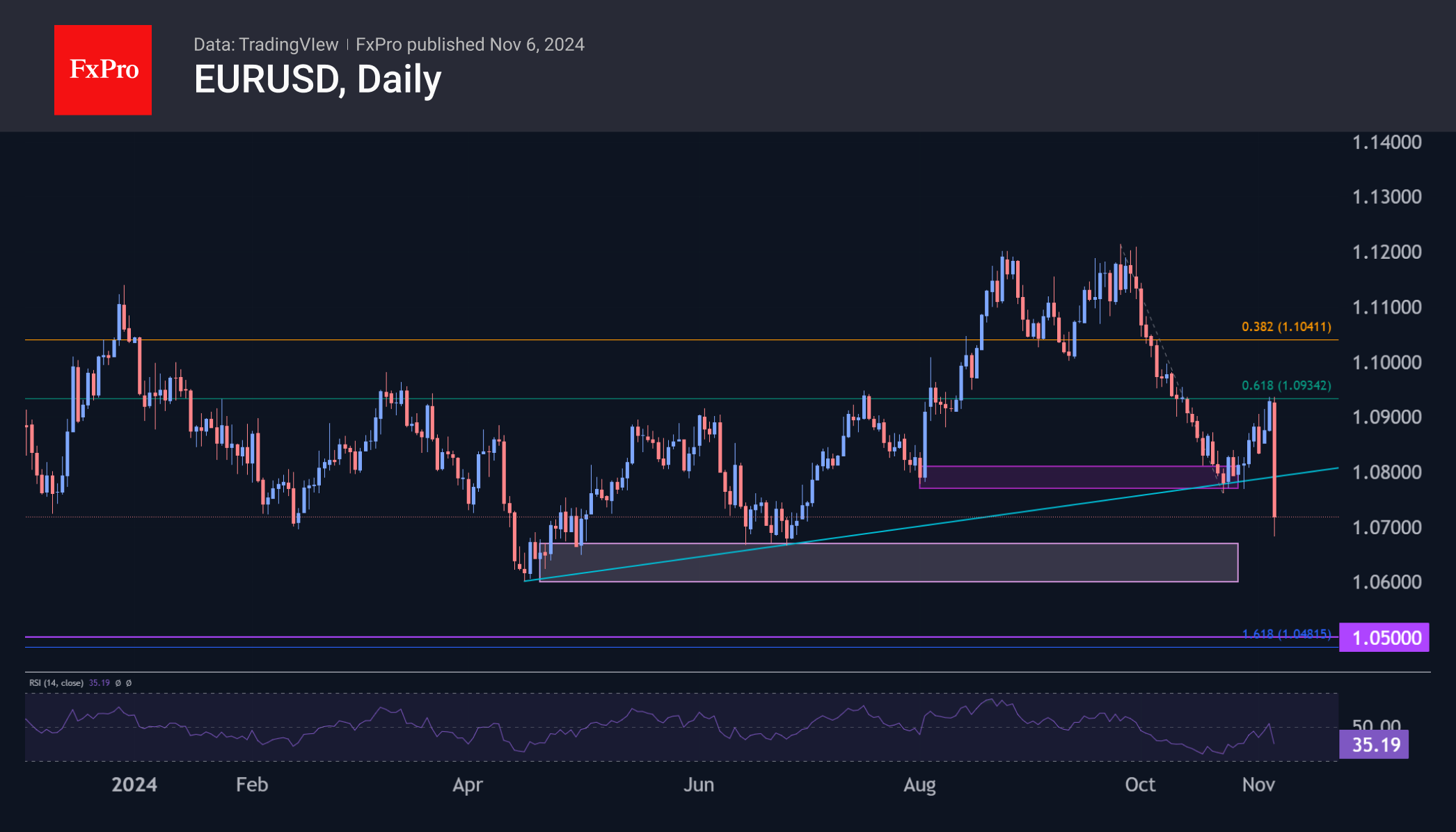 单一货币是特朗普获胜后的输家之一,周三(货币价值)下跌2% 至1.07,为7月以来的最低点。而且这不仅仅是美元强劲的问题,欧元兑瑞士法郎也下跌了约0.7%,兑英镑下跌了0.8%。