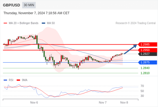 在 1.2875 之上,看涨,目标价位为 1.2950 ,然后为 1.2985 。