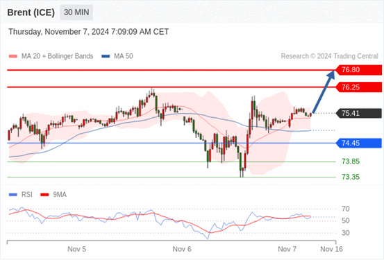在 74.45 之上,看涨,目标价位为 76.25 ,然后为 76.80 。