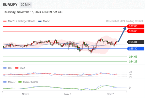 欧元/日元 当日内: 看涨,当 165.30 为支撑位,目标定在167.03。
