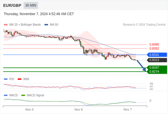 欧元/英镑 当日内: 看跌,在 0.8331 之下。