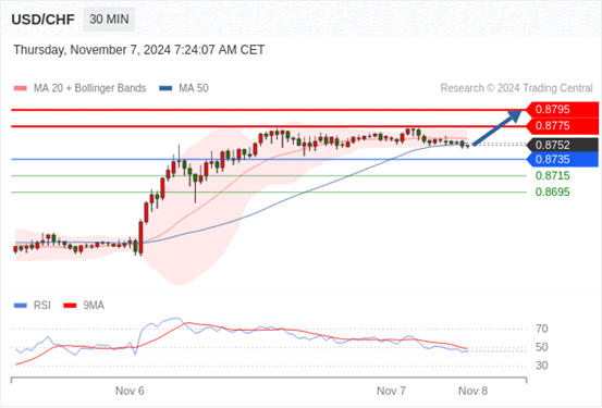 在 0.8735 之上,看涨,目标价位为 0.8775 ,然后为 0.8795 。