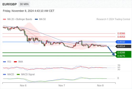欧元/英镑 当日内: 看跌,在 0.8332 之下。