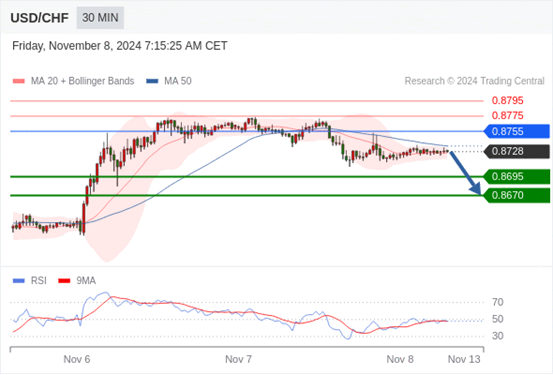 在 0.8755 之下,看跌,目标价位为 0.8695 ,然后为 0.8670 。