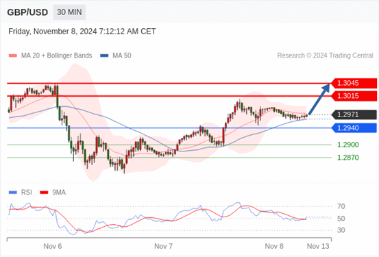 在 1.2940 之上,看涨,目标价位为 1.3015 ,然后为 1.3045 。