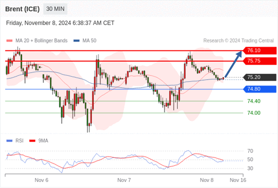 在 74.80 之上,看涨,目标价位为 75.75 ,然后为 76.10 。