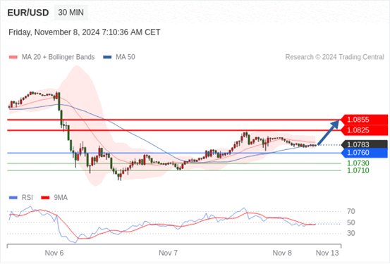 在 1.0760 之上,看涨,目标价位为 1.0825 ,然后为 1.0855 。