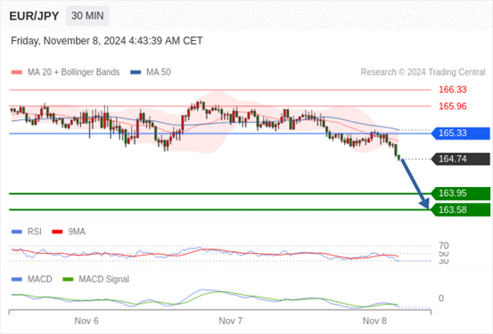 欧元/日元 当日内: 看跌,在 165.33 之下。