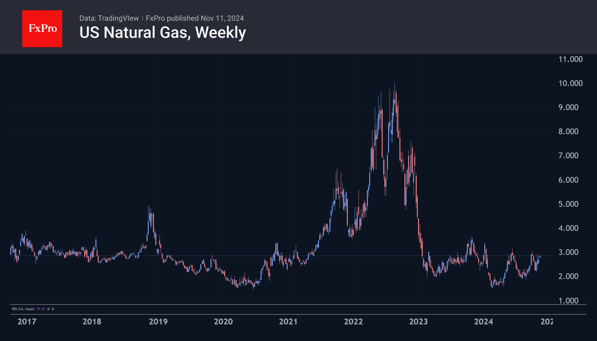 价格在不到两周的时间里又回到了3.0美元区域--高位。今年,3.0 - 3.20美元区域已多次成为关键阻力位,看看这种模式是否会继续下去将会很有趣。鉴于石油的库存水平和动态变化,目前更有可能出现新的下跌趋势。然而,就天然气而言,突破阻力位可能会引发大幅上涨。
