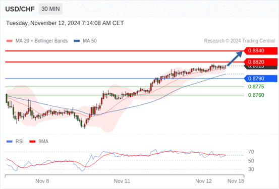在 0.8790 之上,看涨,目标价位为 0.8820 ,然后为 0.8840 。