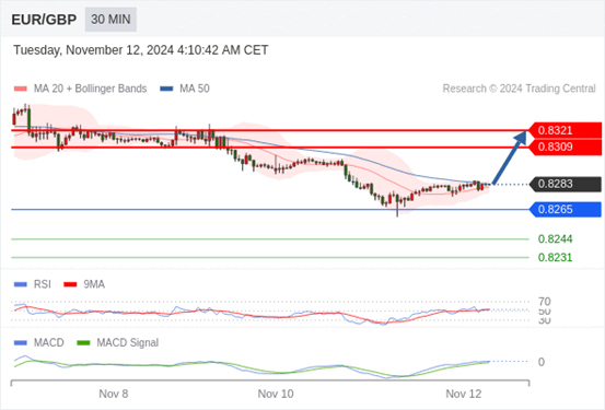 欧元/英镑 当日内: 看涨,当 0.8265 为支撑位。