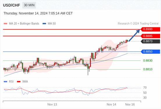 在 0.8850 之上,看涨,目标价位为 0.8885 ,然后为 0.8900 。