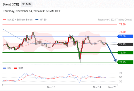 在 72.50 之下,看跌,目标价位为 71.40 ,然后为 70.75 。