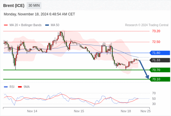 布伦特原油 (ICE)? (F5)? 当日内: 短期关键阻力位在71.80。
