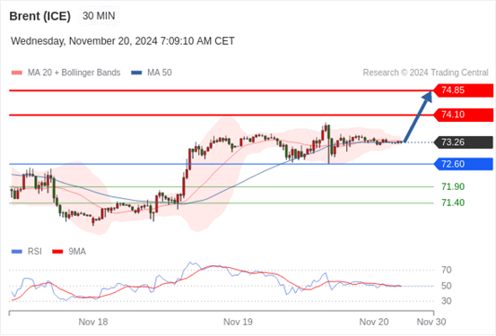 在 72.60 之上,看涨,目标价位为 74.10 ,然后为 74.85 。