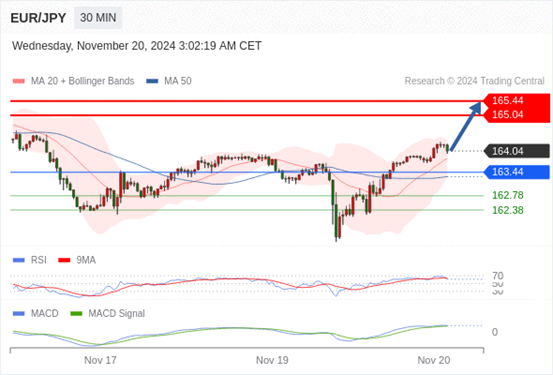 欧元/日元 当日内: 看涨,当 163.44 为支撑位。