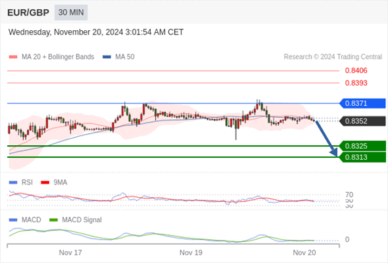 欧元/英镑 当日内: 看跌,在 0.8371 之下。