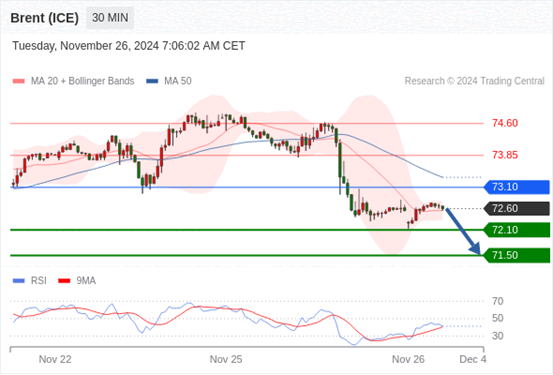 布伦特原油 (ICE)? (G5)? 当日内: 短期关键阻力位在73.10。