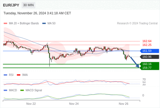 欧元/日元 当日内: 看跌,在 161.59 之下。