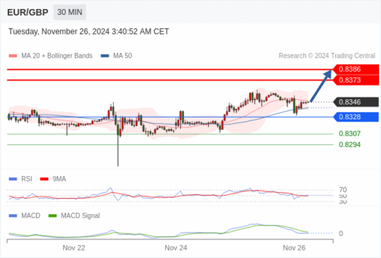 欧元/英镑 当日内: 看涨,当 0.8328 为支撑位,目标定在0.8386。