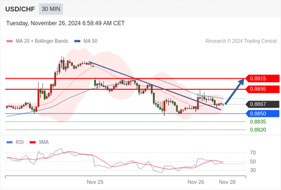 在 0.8850 之上,看涨,目标价位为 0.8895 ,然后为 0.8915 。
