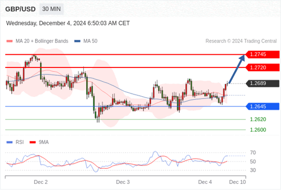 在 1.2645 之上,看涨,目标价位为 1.2720 ,然后为 1.2745 。