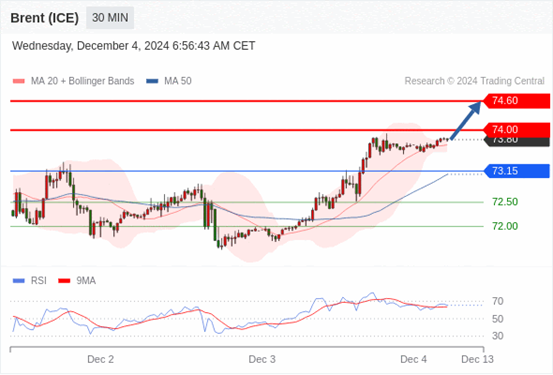 在 73.15 之上,看涨,目标价位为 74.00 ,然后为 74.60 。