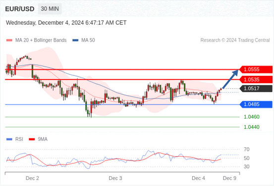 在 1.0485 之上,看涨,目标价位为 1.0535 ,然后为 1.0555 。