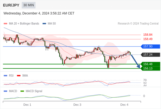 欧元/日元 当日内: 在进一步下跌之前,反弹至 157.90 附近。
