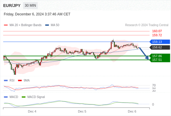 欧元/日元 当日内: 逐渐下跌,当 159.13 阻碍上行,则 157.51 为目标位。