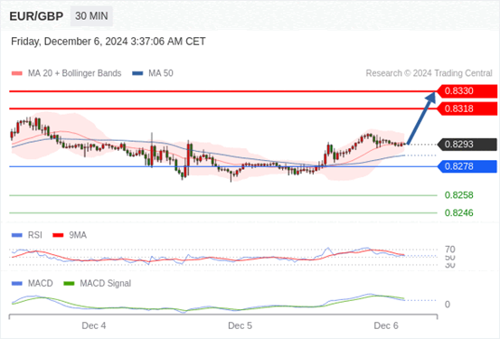 欧元/英镑 当日内: 看涨,当 0.8278 为支撑位,目标定在0.8330。